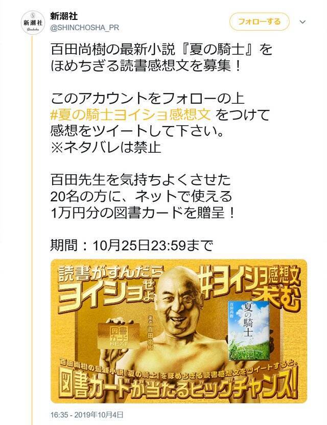 新潮社が百田尚樹さんの最新小説をほめちぎる読書感想文を募集